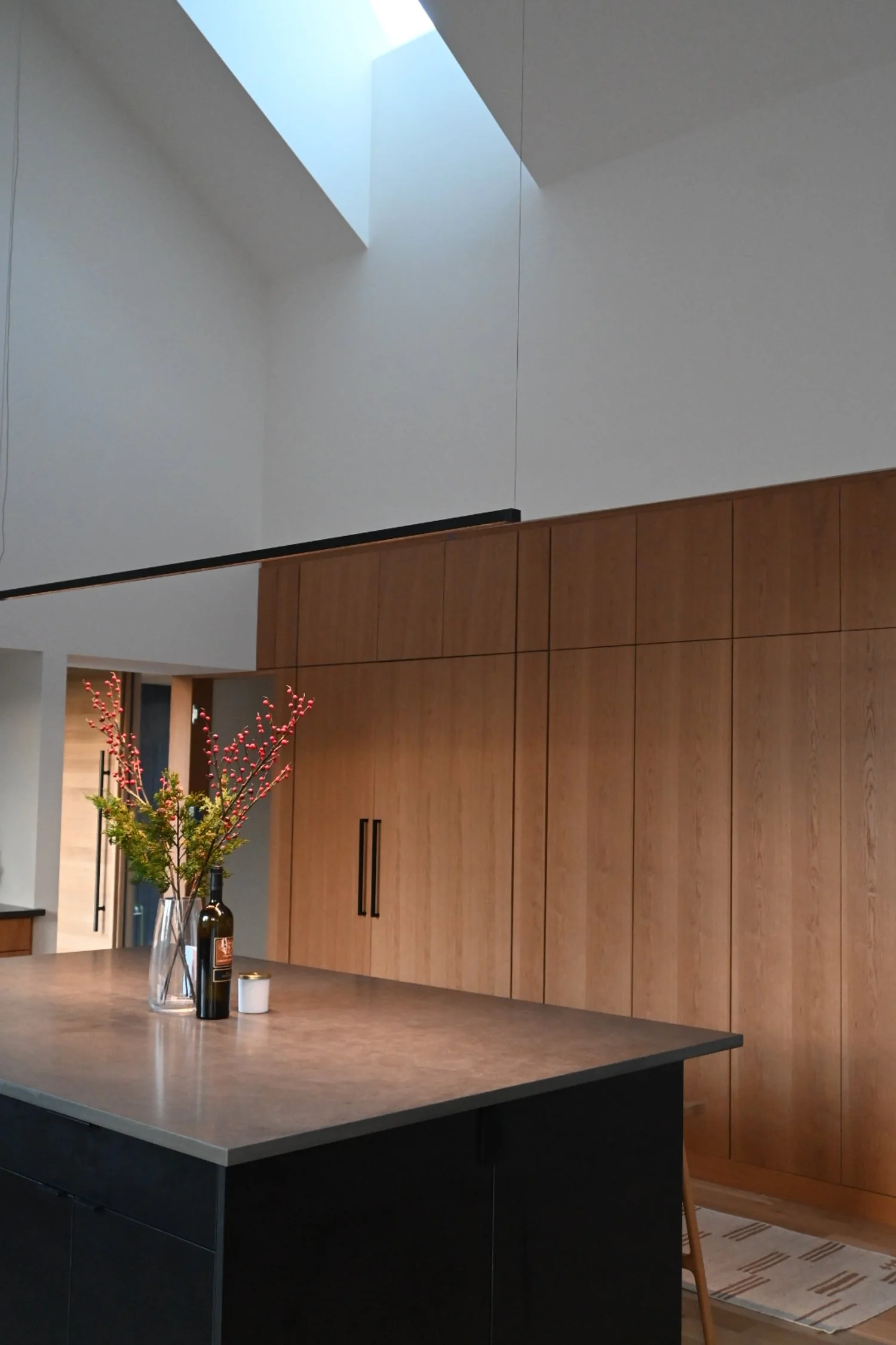 Scandinavian restraint meets Japanese tactility in every detail. The couple envisioned a home that wouldn’t compete with the landscape but respond to it — a place where clean lines, natural materials and elemental quiet would form a kind of dialogue with the surrounding pines and boulders. And from its blackened exterior to its oak-lined interior, Gateway Haus does just that.